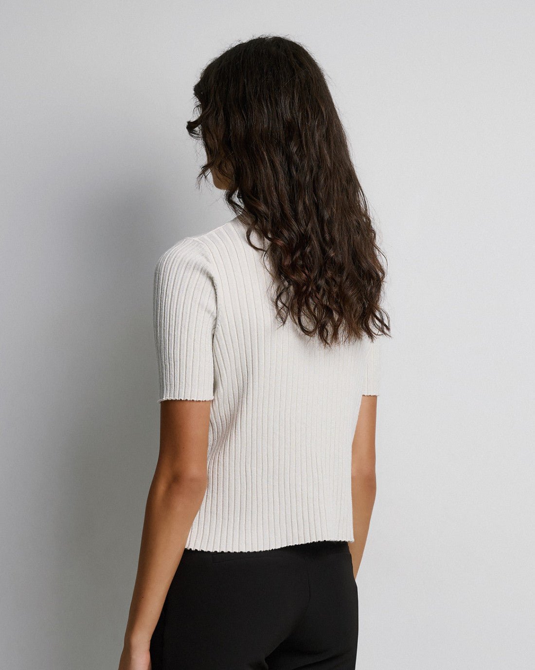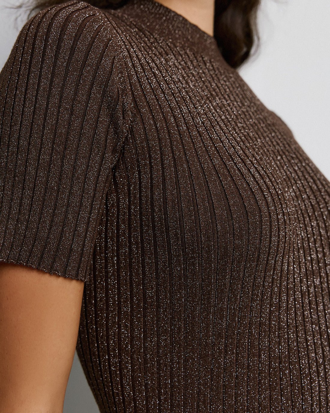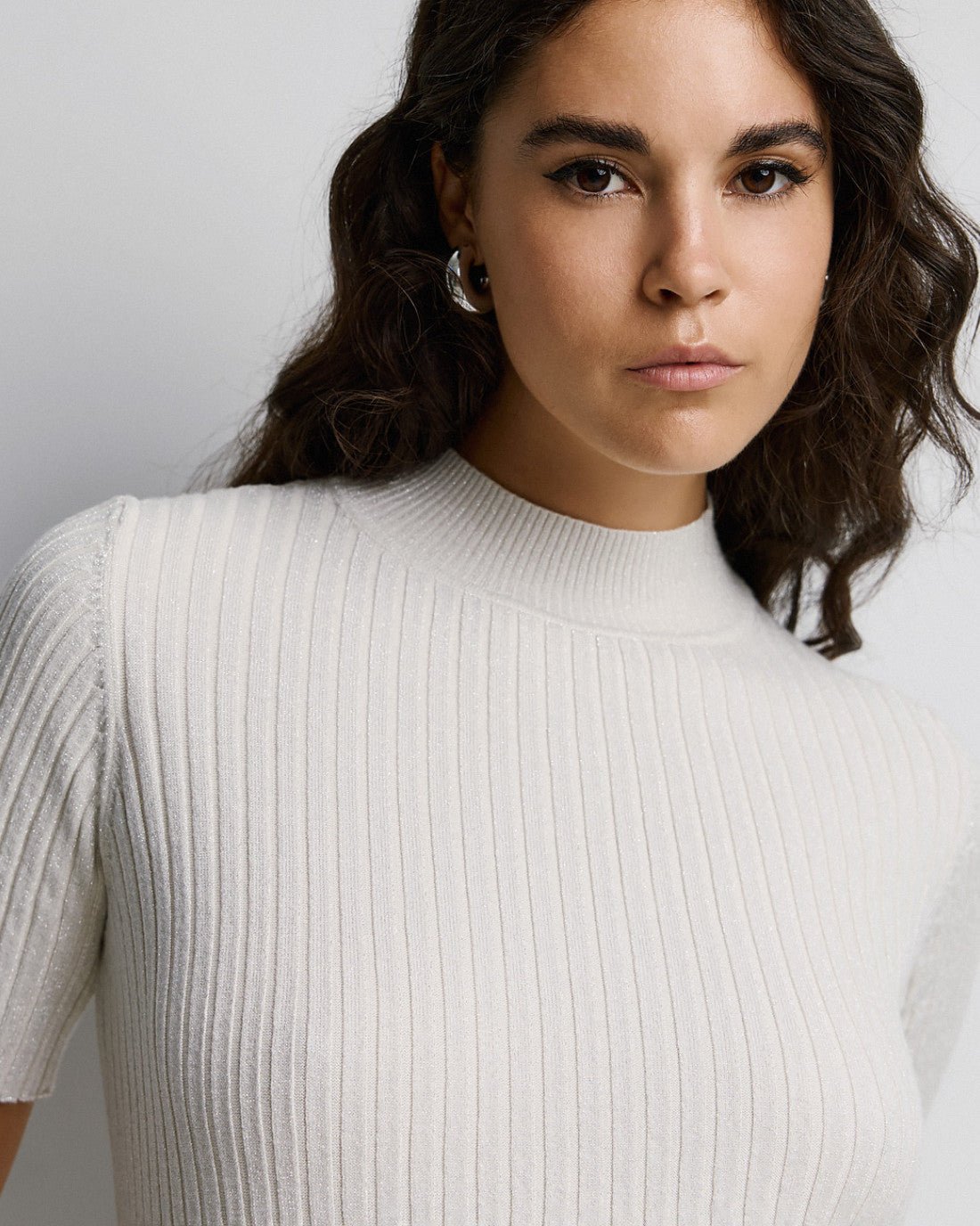 Κοντομάνικη ριπ μπλούζα με lurex λεπτομέρειες και ψηλό λαιμό. Αποτελεί ιδανική επιλογή για λαμπερές all-day εμφανίσεις.