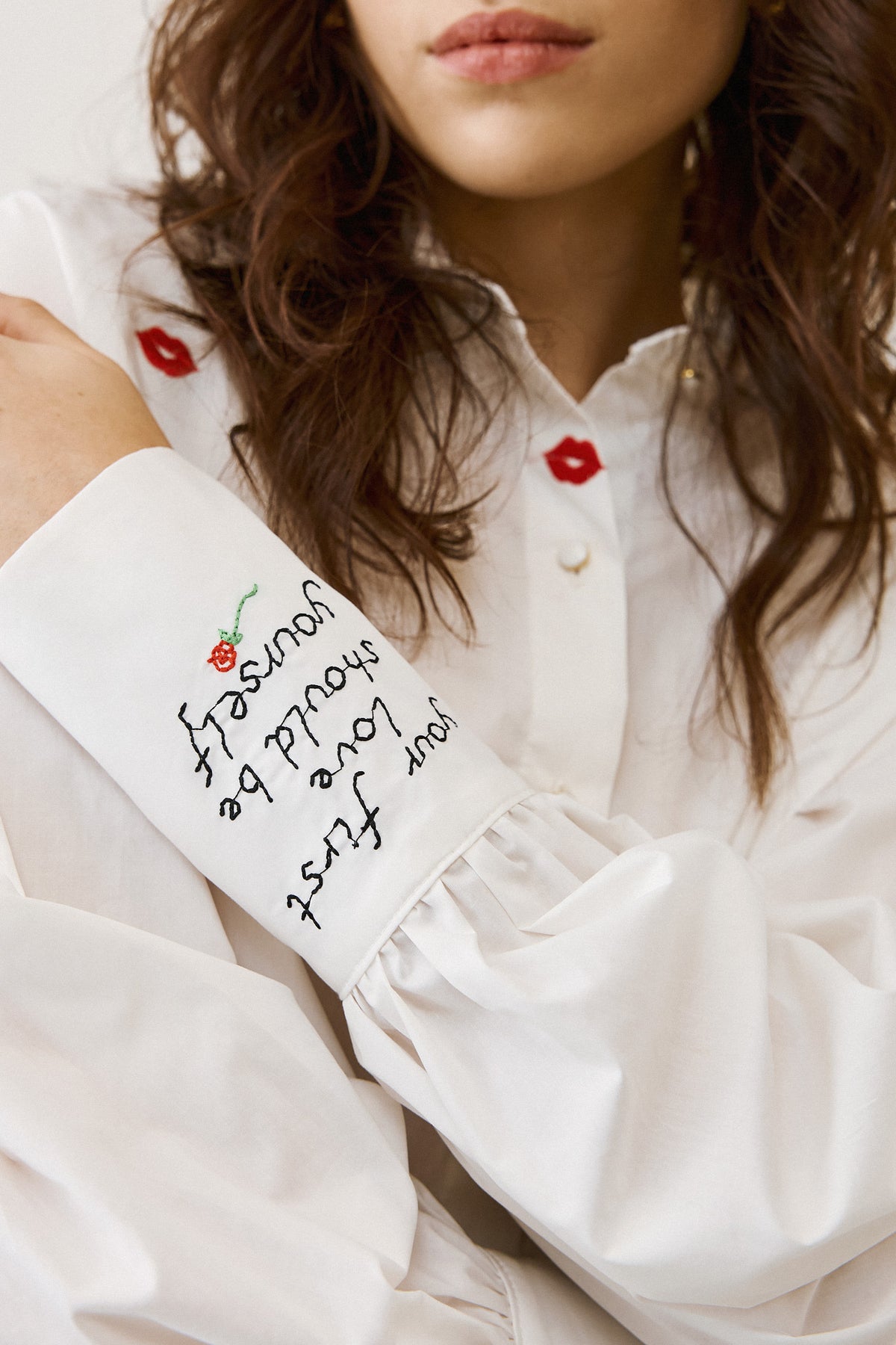 Τα κόκκινα κεντημένα φιλάκια στο μπροστινό μέρος χαρίζουν μια ρομαντική πινελιά, ενώ στη μία μανσέτα ξεχωρίζει η φράση «your first love should be yourself». Στην πλάτη, το κέντημα «merci» με διακριτικές πέρλες στο γράμμα Μ προσθέτει ένα κομψό, θηλυκό φινίρισμα.