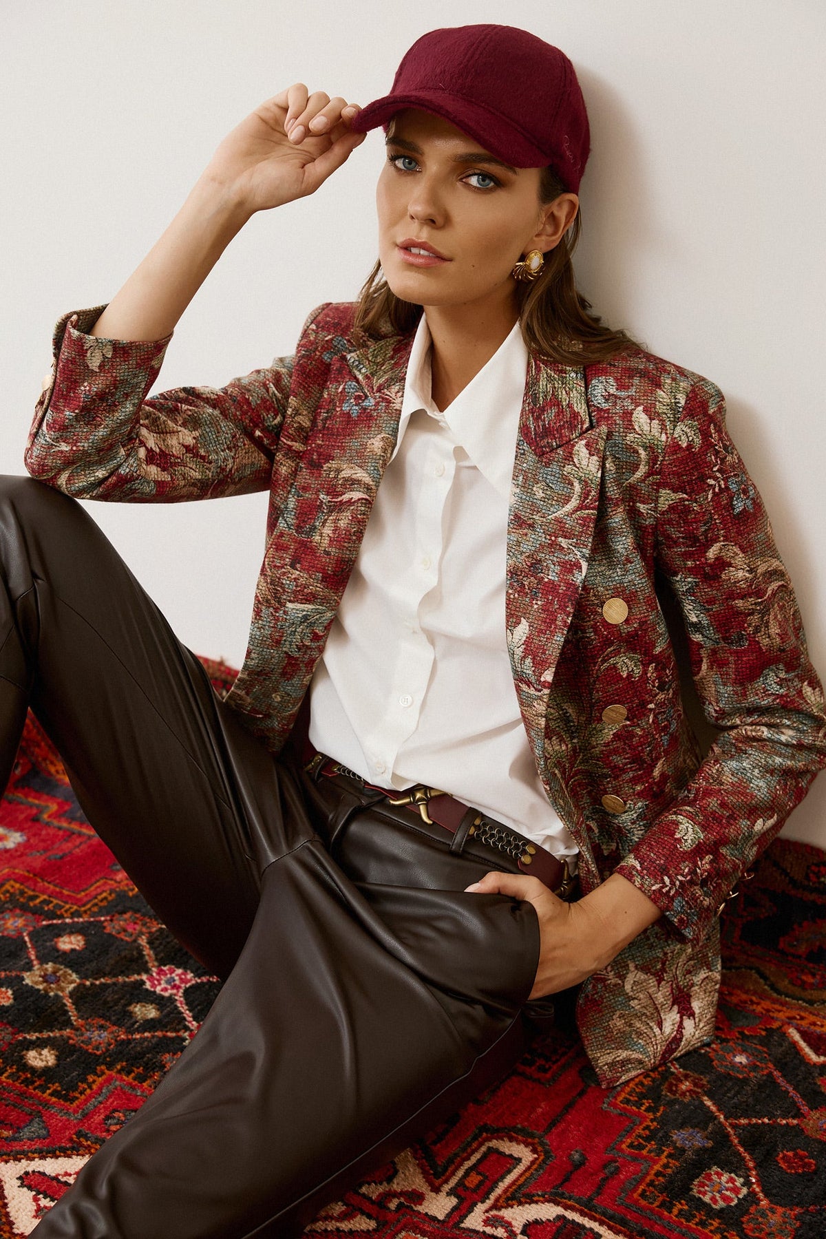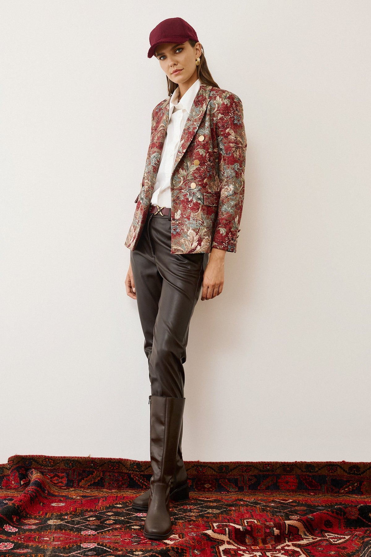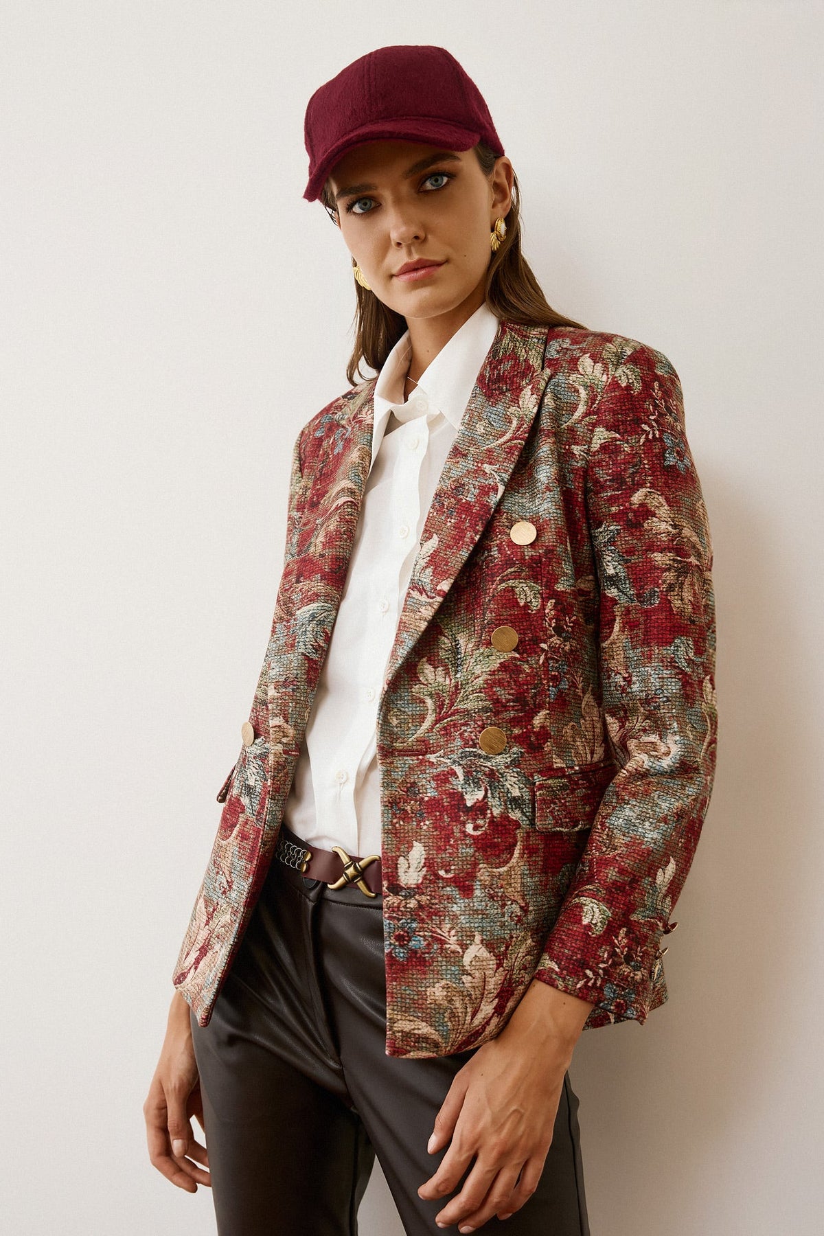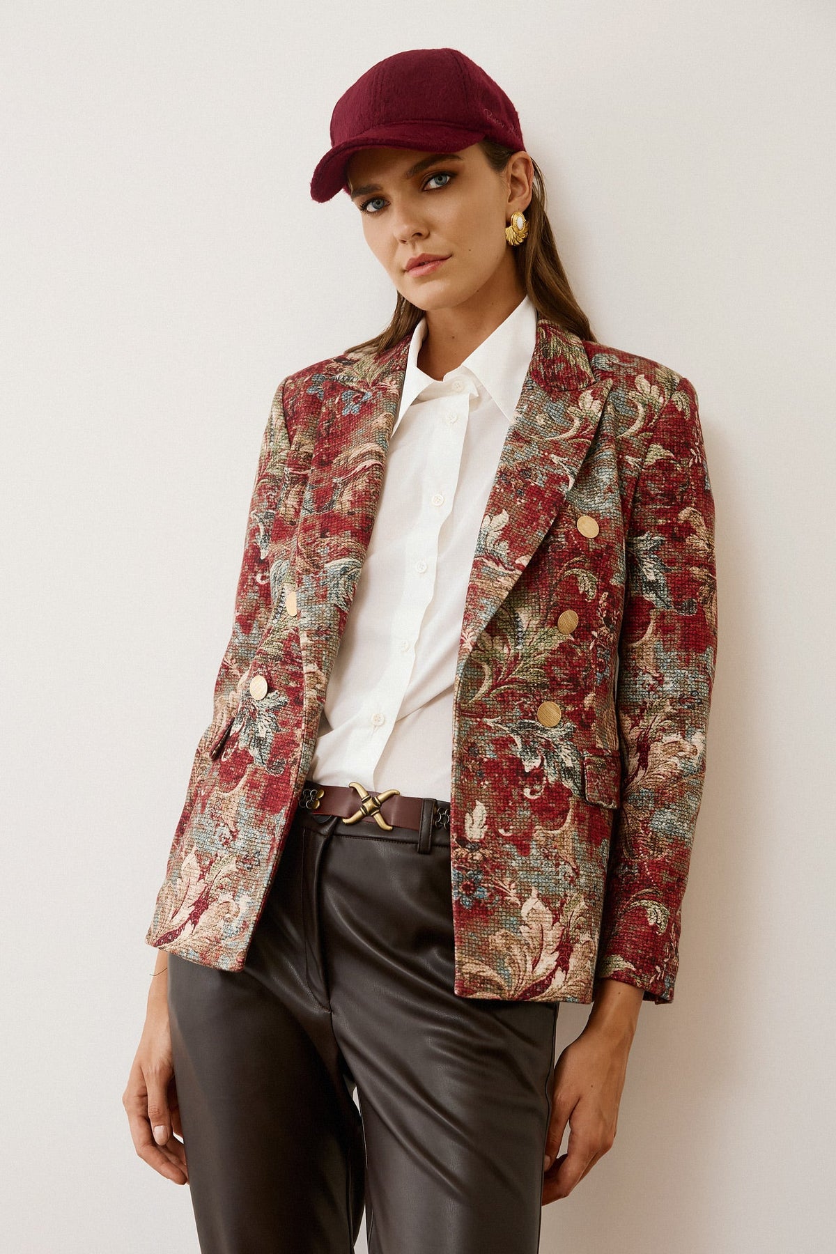 Σταυρωτό σακάκι με σχέδιο και βάτες στους ώμους. Διαθέτει τσέπες με καπάκι μπροστά και χρυσά κουμπιά.