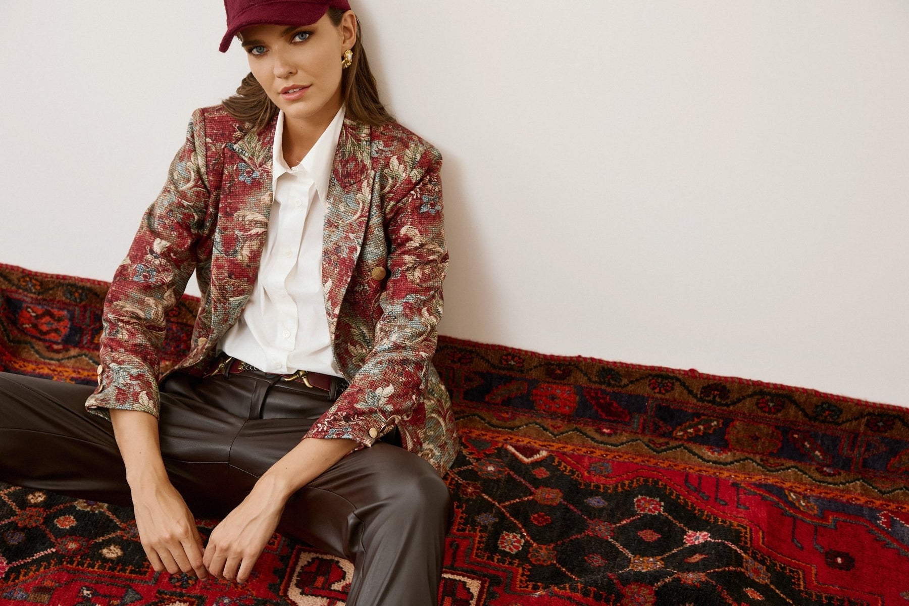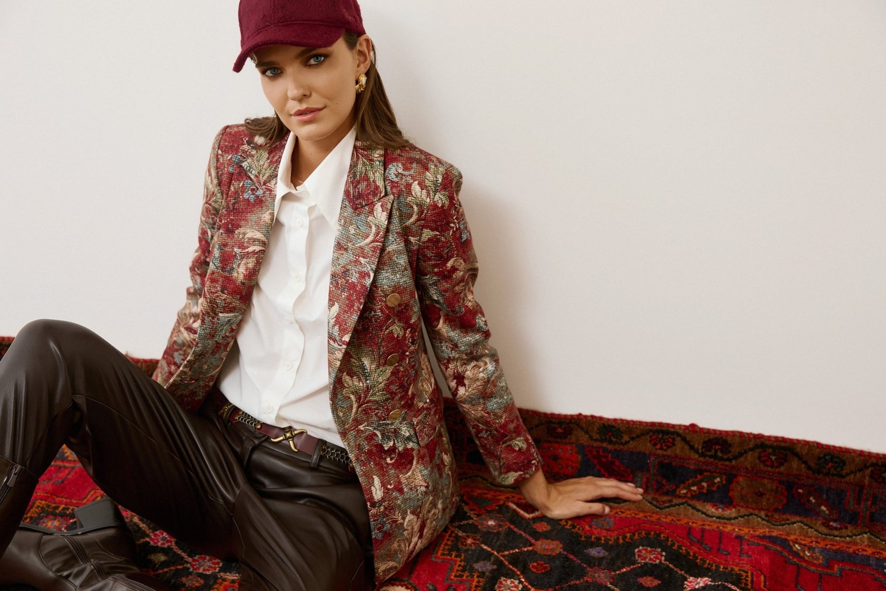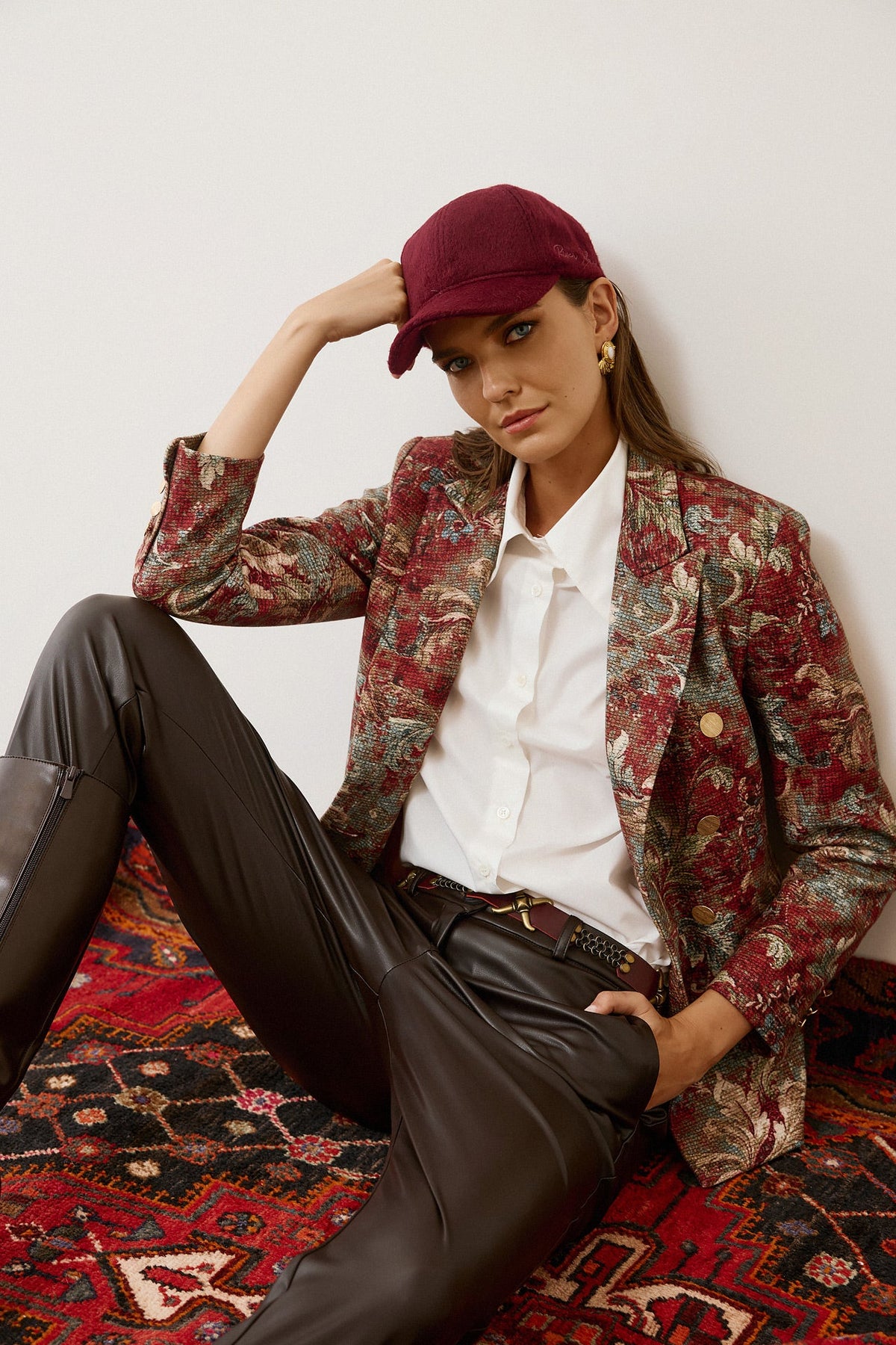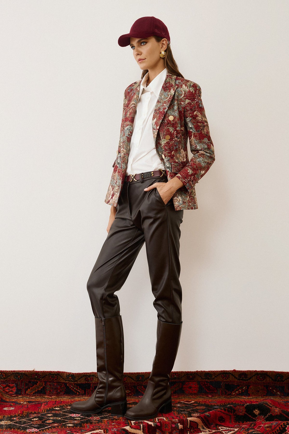 Σταυρωτό σακάκι με σχέδιο και βάτες στους ώμους. Διαθέτει τσέπες με καπάκι μπροστά και χρυσά κουμπιά.
