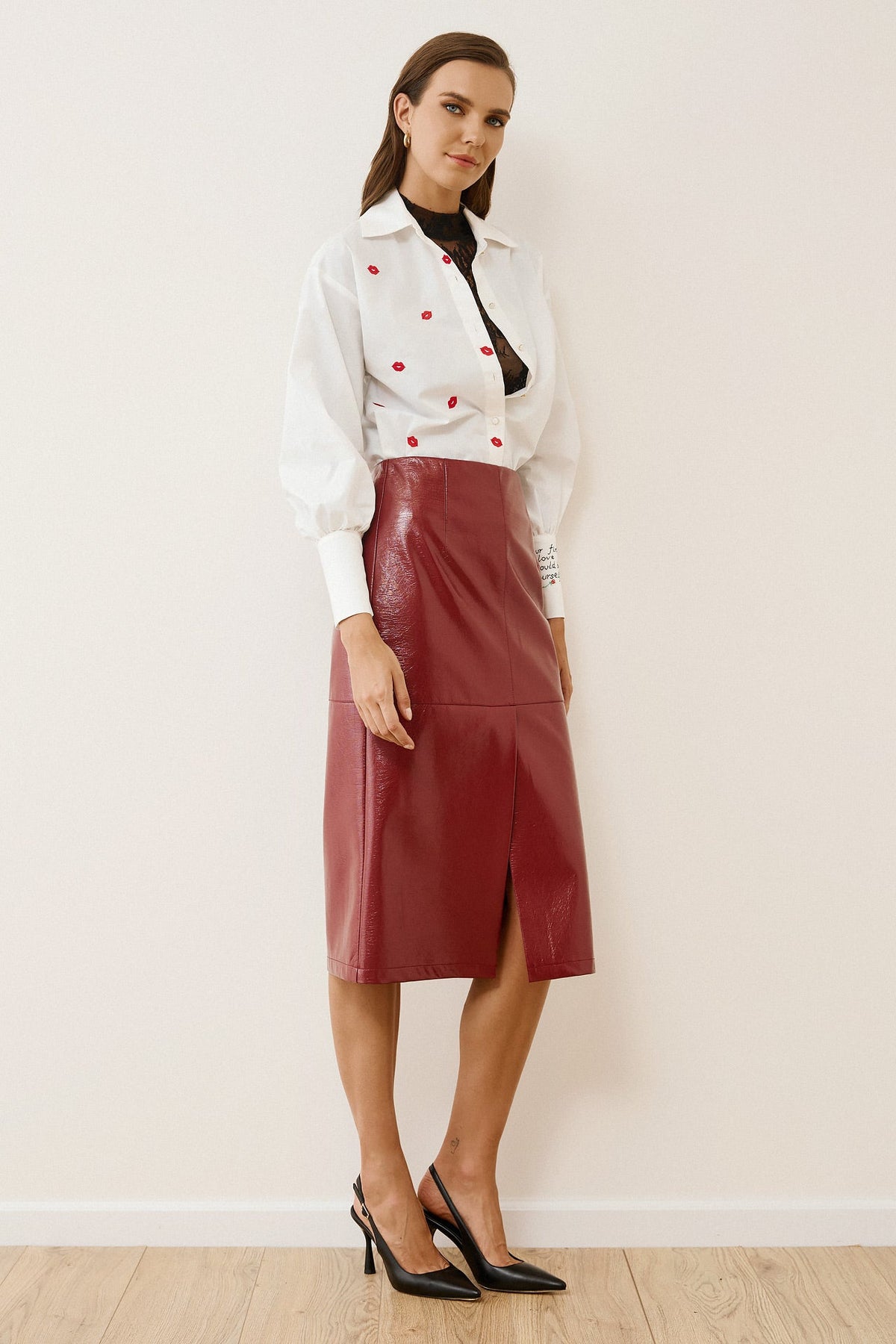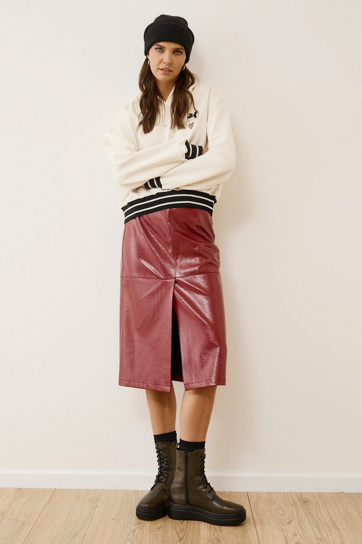 Μίντι φούστα vinyl με εντυπωσιακό σκίσιμο μπροστά. Διαθέτει κρυφό φερμουάρ στο πίσω μέρος. Ιδανική επιλογή για ξεχωριστές και κομψές επίσημες εμφανίσεις.