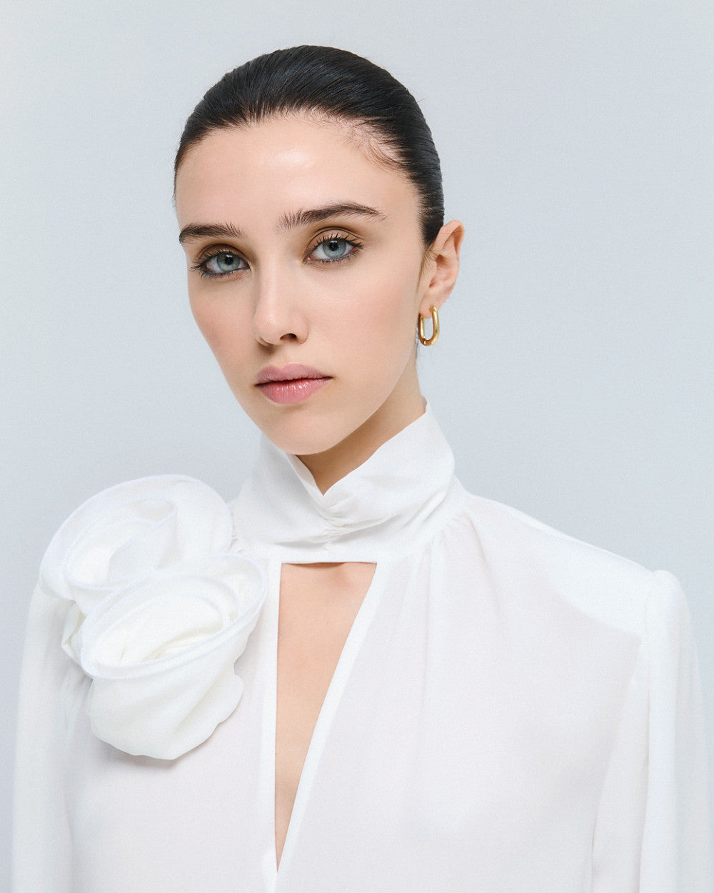Μπλούζα με ψηλό λαιμό και V άνοιγμα. Διαθέτει μακριά μανίκια με βάτες, διακοσμητικά λουλούδια και λεπτομέρειες από σούρες. Ιδανική επιλογή για στιλάτες επίσημες εμφανίσεις.