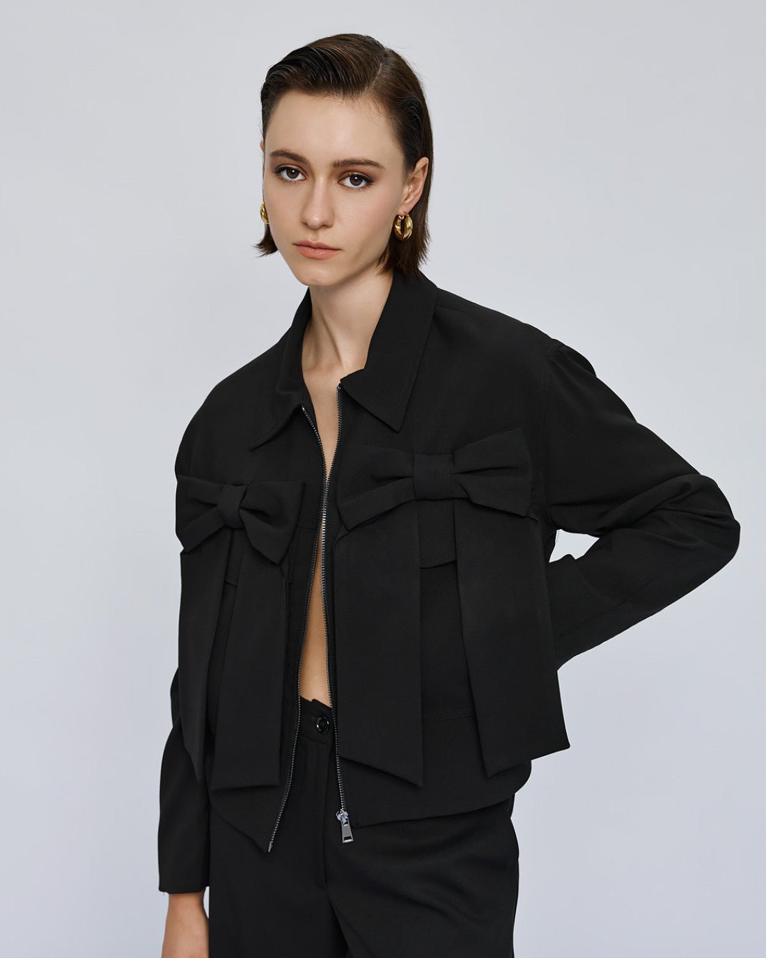 Bomber τζάκετ με φιόγκους και γιακά. Διαθέτει μακριά μανίκια και κλείσιμο με φερμουάρ μπροστά. Επιλέξτε το για ξεχωριστές εμφανίσεις.