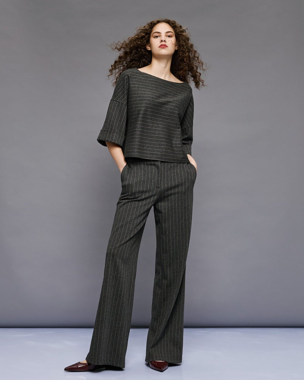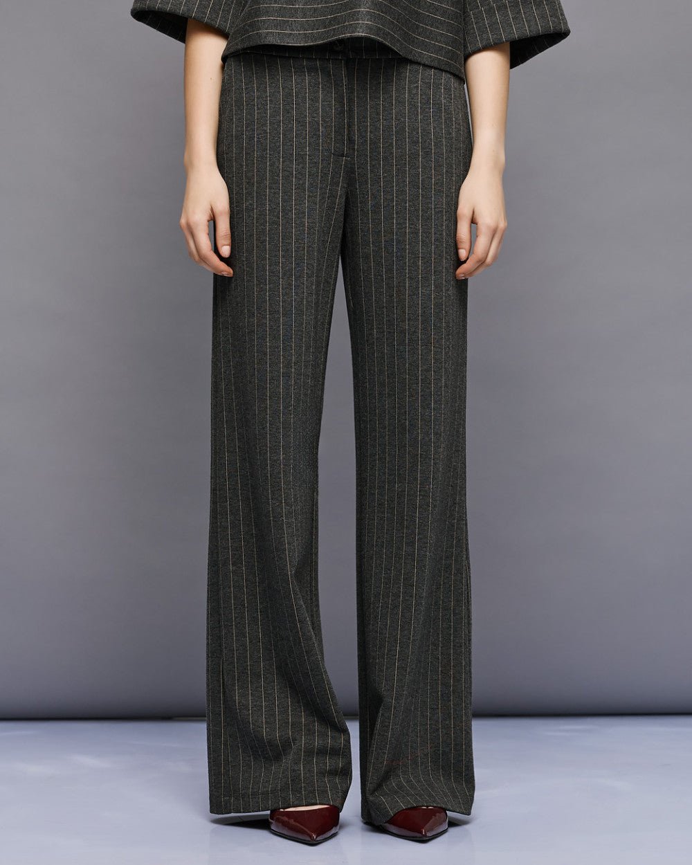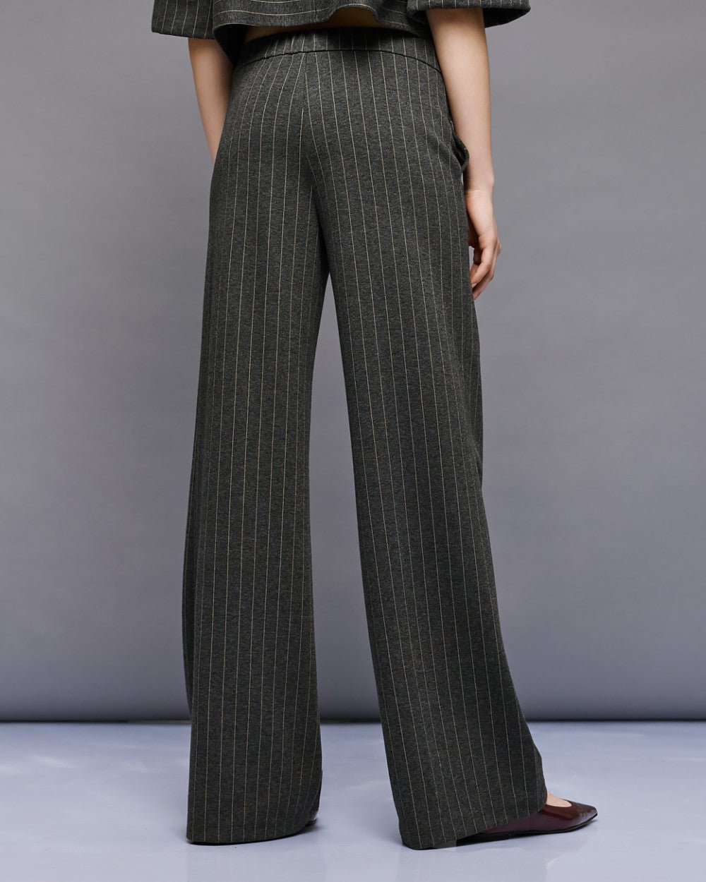 Ψηλόμεσο φαρδύ ριγέ παντελόνι με ελαστική μέση και κλείσιμο με φερμουάρ και κουμπί μπροστά. Συνδυάστε με την αντίστοιχη μπλούζα από τη συλλογή μας για κομψά και άνετα looks.