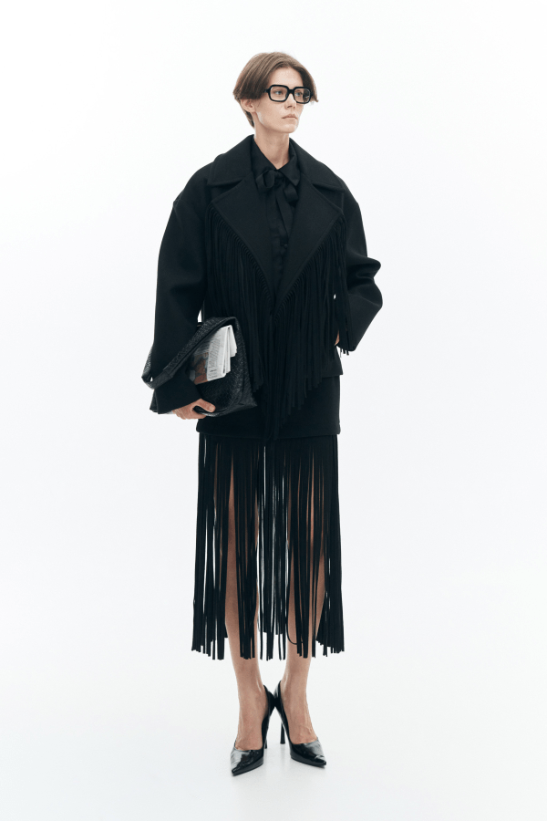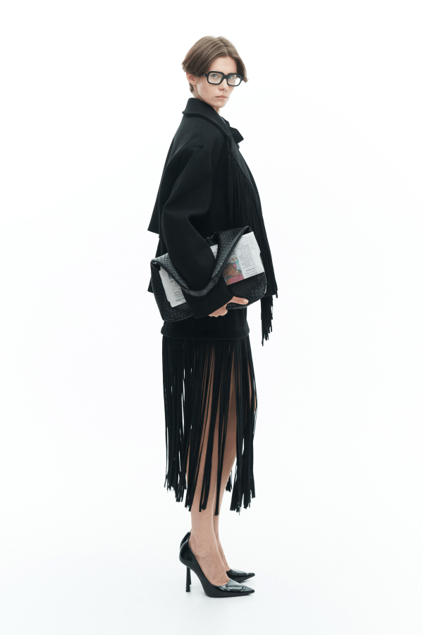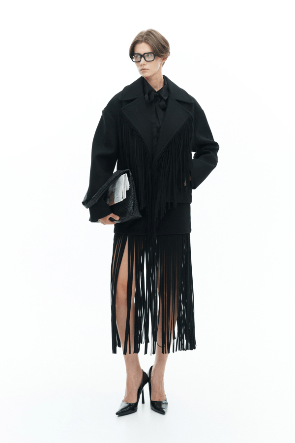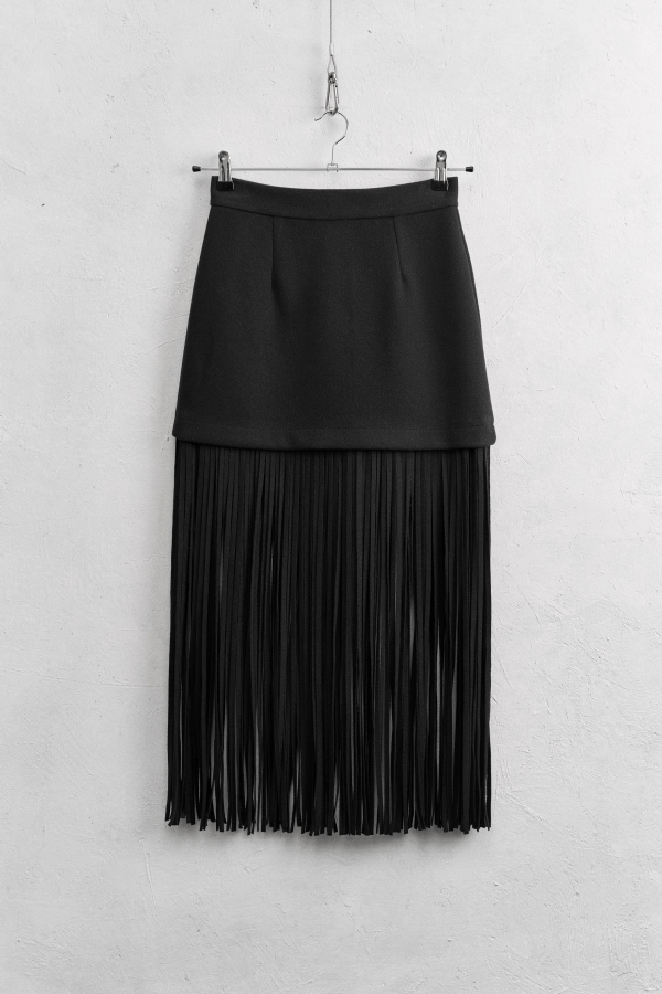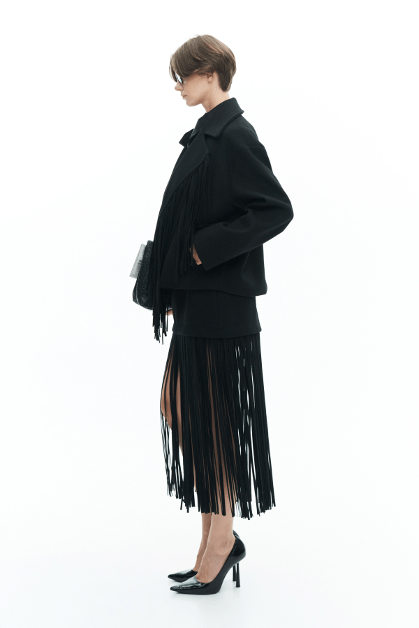 Μια statement φούστα που συνδυάζει minimal γραμμή με εντυπωσιακή κίνηση. Το επάνω μέρος αγκαλιάζει απαλά τη μέση, ενώ το κάτω μέρος διακοσμείται με μακριά κρόσσια που χαρίζουν αέρινη, θεατρική κίνηση σε κάθε βήμα. Midi μήκος, ιδανικό για ιδιαίτερες εμφανίσεις και fashion-forward looks. Είναι suede και κλείνει στο πίσω μέρος με φερμουάρ. Φοριέται από το πρωί μέχρι το βράδυ, αναβαθμίζοντας αμέσως κάθε outfit.