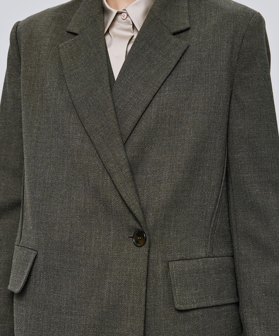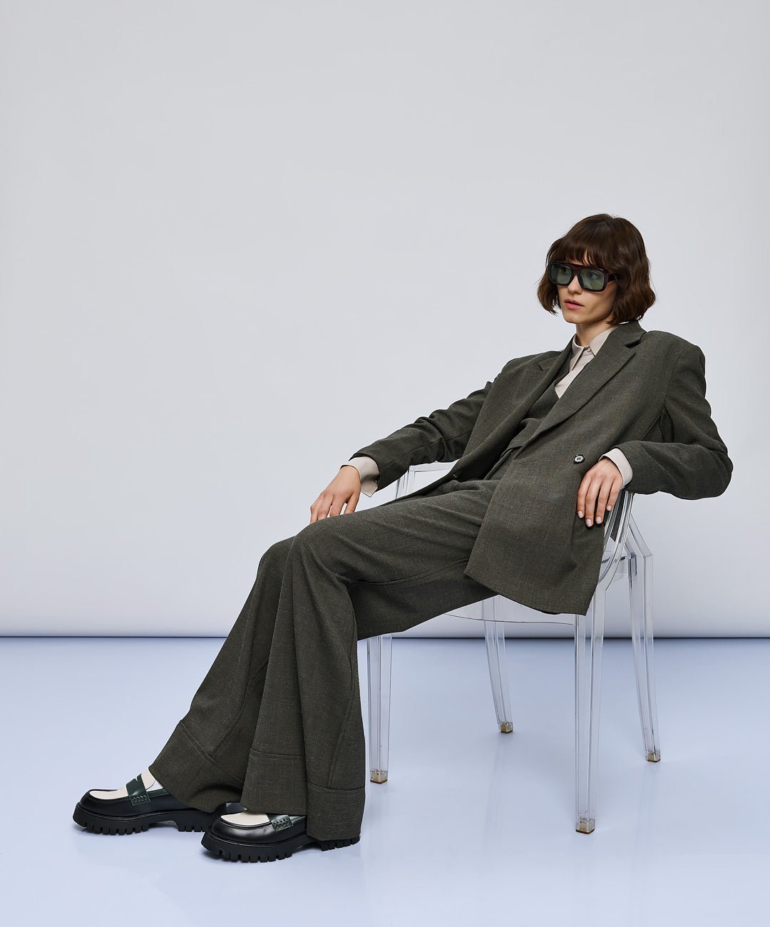 Oversized σακάκι με πέτο γιακά και τσέπες με καπάκι στο μπροστινό μέρος. Διαθέτει βάτες και κλείνει με κουμπιά μπροστά. Συνδυάστε με το αντίστοιχο παντελόνι από τη συλλογή μας για ολοκληρωμένες και κομψές εμφανίσεις.